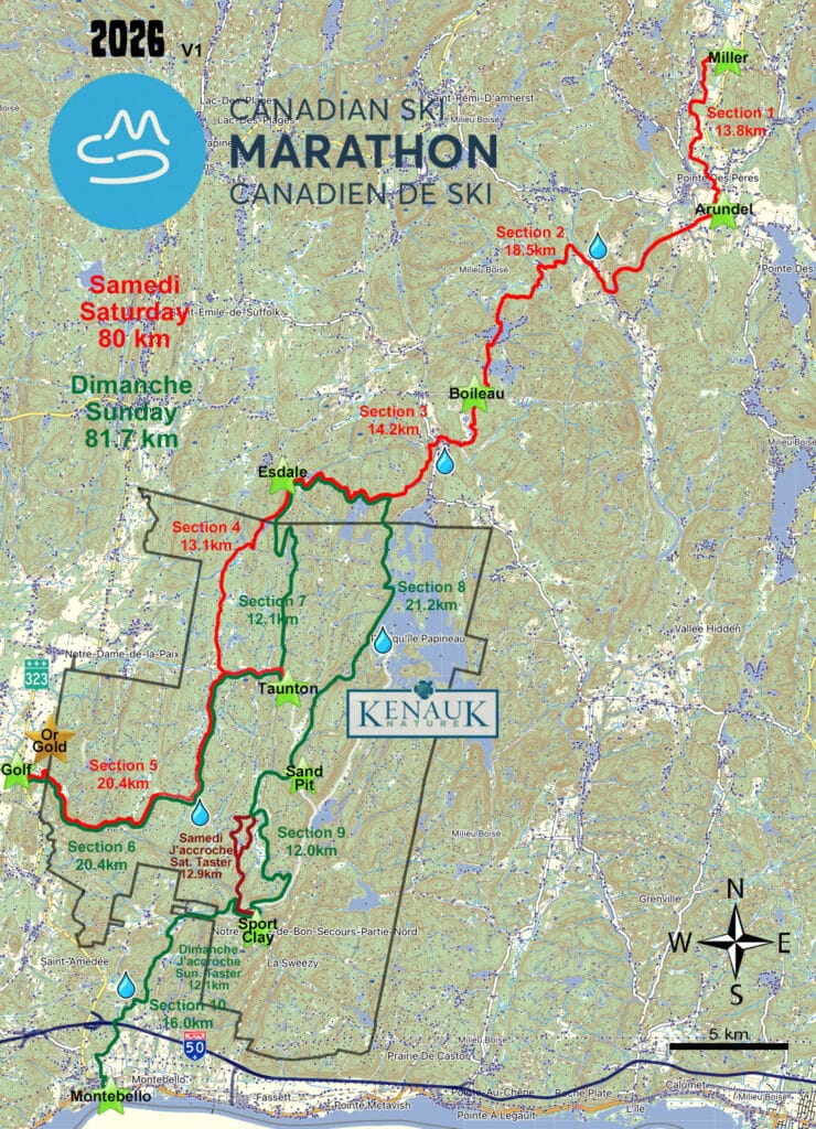 Le sentier commence au terrain de golf Héritage par une descente abrupte sur la première allée, puis traverse une vallée fluviale boisée et entame une longue montée, avec un gain de 100 m, dans Kenauk Nature. Il suit la route de Sugarbush avec ses nombreux virages et collines, puis se dirige vers le nord sur la route historique de Bourassa, qui était la principale route de Montebello à St Jovite dans les années 1800 et qui est devenue plus tard la route de ski préférée du légendaire Jack Rabbit Johannsen. Le premier kilomètre est en montée, puis 5 km de descente gratifiante. Il se termine par une montée d’un demi-kilomètre jusqu’au point de contrôle près du lac Taunton. Il y a un point de sécurité à mi-chemin de la section avec de l’eau en quantité limitée, alors apportez des collations et de l’eau. (420 m de montée, 310 m de descente).