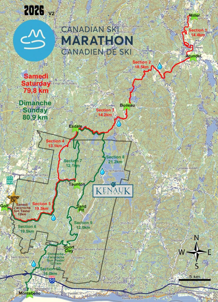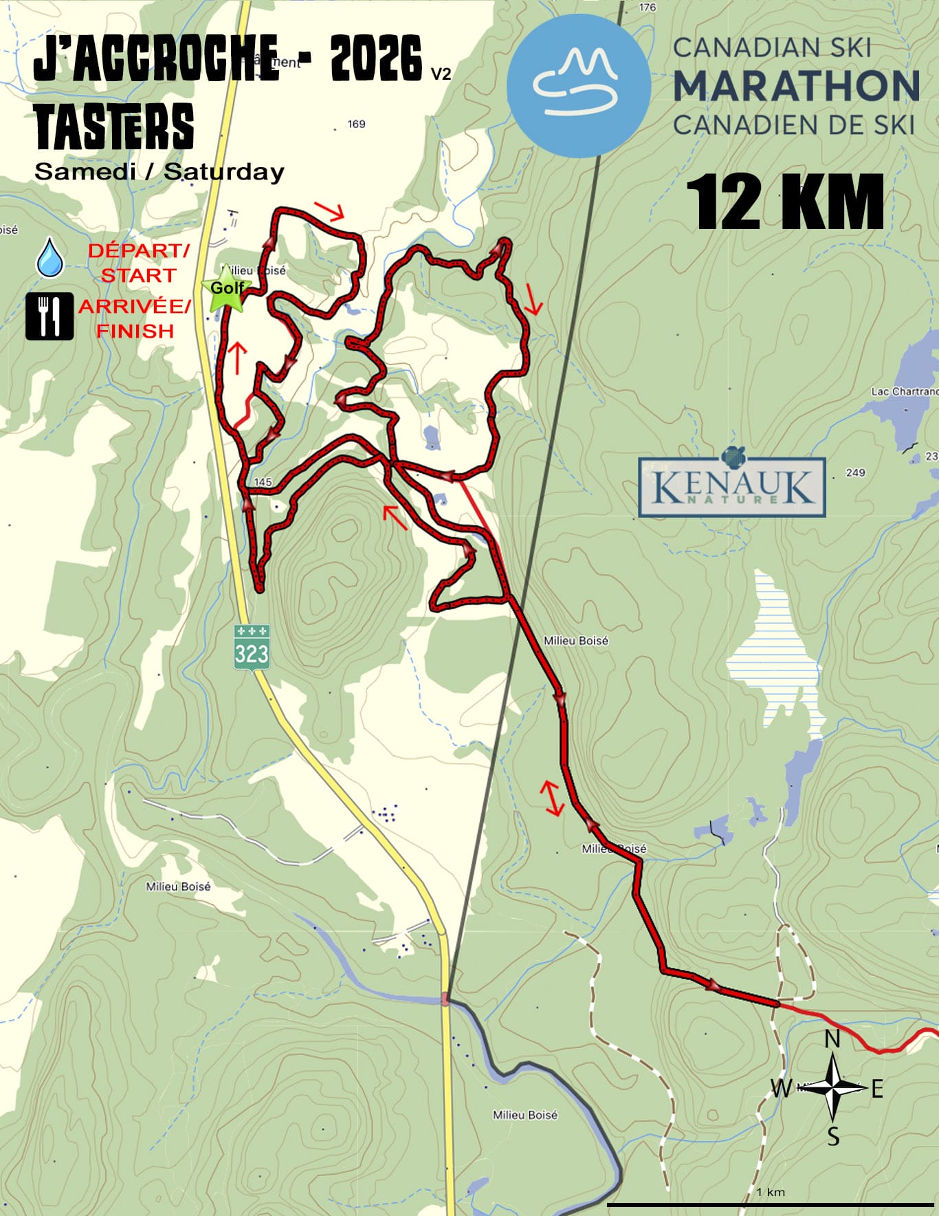 Les skiers, J’accroche, ont leur propre parcours le samedi, car la dernière section du parcours principal est plus longue et plus difficile que beaucoup ne le souhaiteraient. Les skieurs partent du point de contrôle Golf Héritage à Notre-Dame de la Paix, qui est également la ligne d’arrivée. Le parcours suit les pistes établies autour du terrain de golf, serpentant dans la forêt et les fairways. À un moment donné, il rejoint le parcours régulier de la section 5 du marathon et le suit en sens inverse sur environ 2 km, avant de faire demi-tour et de revenir au terrain de golf. Les skieurs continuent sur les pistes du terrain de golf et passent sous l’arche d’arrivée avec tous les autres skieurs.