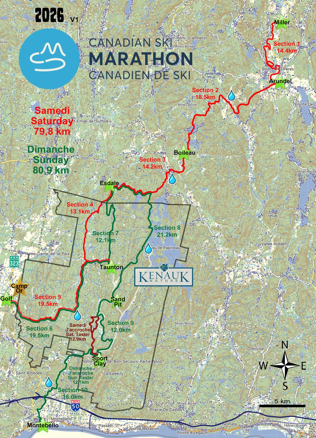 Tasters who feel that the last section of the day (Section 10) is too long and difficult have the option of starting further down the trail to reduce length and hills. The trail starts at the Kenauk Nature welcome building and follows the same path as the other skiers to the finish line in Montebello.